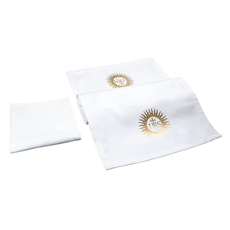 Das Set der Kelchwäsche besteht aus einem Handtuch (24 cm x 22 cm) und einem Purifikator (44 cm x 22 cm) mit goldenem IHS-Emblem. Der Stoff zeichnet sich durch eine hohe Saugfähigkeit aus, wodurch er Feuchtigkeit von der Oberfläche gut aufnehmen kann. Durch den dreilagigen Stoff dringen Schmutz und Wasser tief in das Material ein, ohne nach außen zu gelangen.