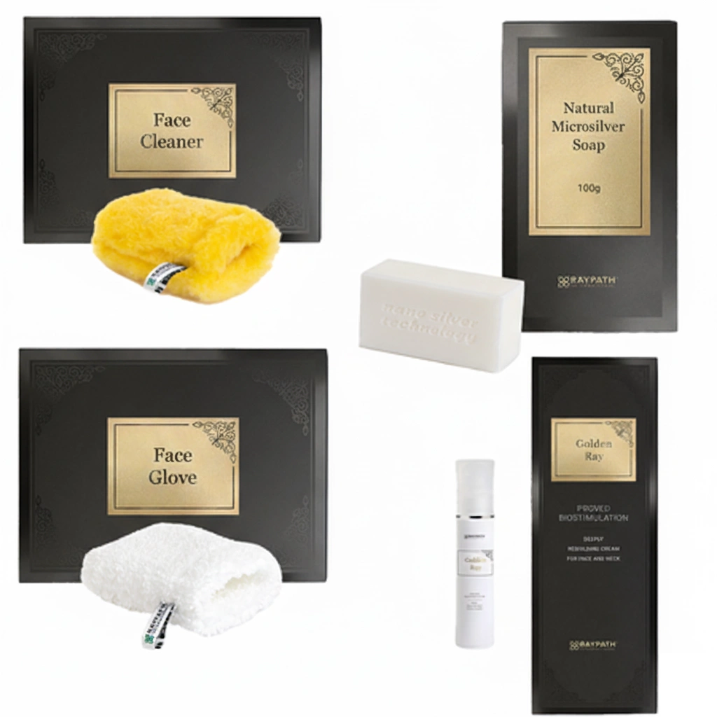 - The set includes: Face Cleaner - face and décolleté exfoliation glove, Face Glove - makeup remover and face wash, nano-silver soap - white, regenerating cream - Golden Ray. Great for gifts as well as everyday use.