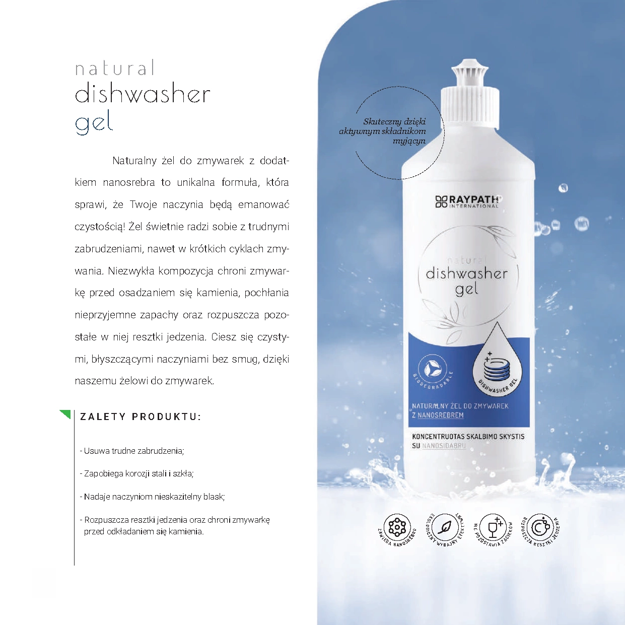 - Ekologiškas indaplovių gelis su nanosidabru. Puikus gebėjimas susidoroti su sudėtingomis dėmėmis net per trumpus skalbimo ciklus. Apsaugo indaplovę nuo kalkių nuosėdų, sugeria kvapus ir tirpdo indaplovėje esančius maisto likučius.