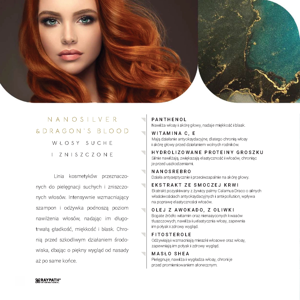 - Głęboko nawilżająca odżywka do włosów suchych i zniszczonych z ekstraktem Dragon's Blood oraz nanosrebrem. Zwiększa poziom nawilżenia oraz pielęgnuje włosy. . Dodaje włosom aksamitną gładkość i miękkość w dotyk. Ułatwia rozczesywanie.